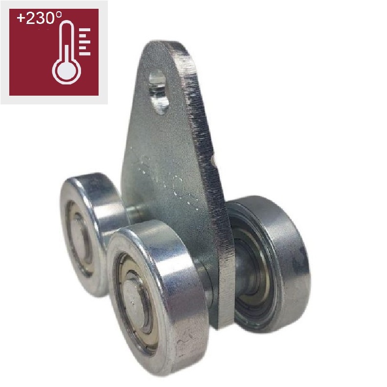 Особенностью высокотемпературных тележек системы 213 является скругление пластины для подвеса, что дает возможность использовать подвес, обеспечивающий качение подвешиваемого предмета. Тележки для покрасочных камер созданы для эксплуатации при температурах от -20 до +230С. Специальная высокотемпературная смазка обеспечивает защиту подшипников при высоких температурах.